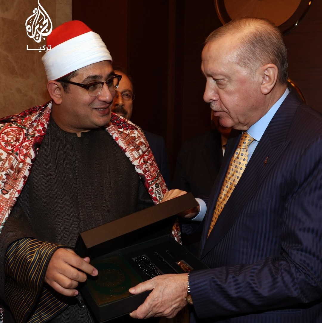 شهد اللقاء تبادلا للهدايا بين الشيخ محمود الشحات أنور والرئيس التركي رجب طيب أردوغان. وأهدى الشيخ محمود الشحات الرئيس التركي نسخة من “مصحف مصر الشريف”، في خطوة جاءت تعبيرا عن الامتنان لحفاوة الاستقبال وكرم الضيافة خلال الفعالية التي أُقيمت في القصر الرئاسي.