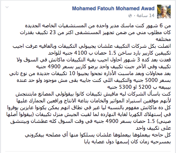 يقول أحد مستخدمي الفيس بوك :"من 6 شهور كنت ماسك مدير احدى المستشفيات الخاصه الجديده ،كان مطلوب مني من ضمن تجهيز المستشفى اكتر من 23 جهاز تكييف بقدرات مختلفه، اتصلت بكل شركات التكييف علشان يجيبولي التكييفات وبالعافيه عرفت اجيب تكييفين ، 1.5 حصان بـ 4100 جنيه للواحد، قعدت بعد كده 3 شهور احاول اجيب بقية التكييفات مكنش في السوق ولا تكييف وفي الآخر جبت تكييف واحد برضو بسعر 4900 جنيه