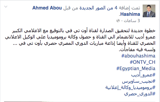 وكانت الأنظار اتجهت إلى أحمد أبو هشيمة، خلال الفترة الماضية، ووصفه البعض بأنه يسعى لإنشاء إمبراطورية إعلامية، خاصة بعد شرائه مؤخرًا كامل أسهم شركة قناة "أون تي في" من رجل الأعمال نجيب ساويرس.