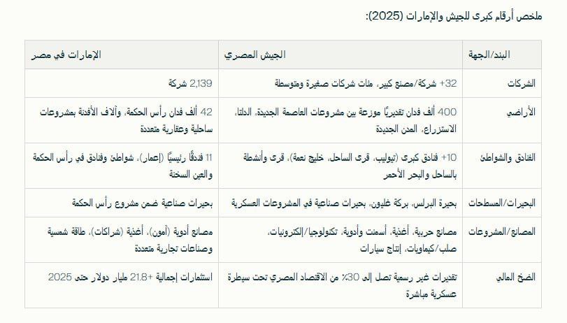 وختاما تفرض هيمنة الجيش والمستثمر الإماراتي واقعًا مريرًا، يشهد انتقال الثروة الوطنية بخطوات محمومة من الشعب إلى تحالفات السلطة والمال العسكري الخليجي معًا. إن الحديث عن الاستقلال الاقتصادي أو سيادة مصر على مواردها بات اليوم مجرد رواية خالية من الأدلة، أمام أرقام ومشروعات وصفقات بيع بالجملة، لا يجد فيها المواطن سوى الخسارة الدائمة لمستقبله وحقوقه في وطنه.